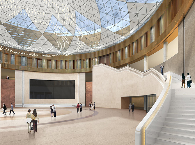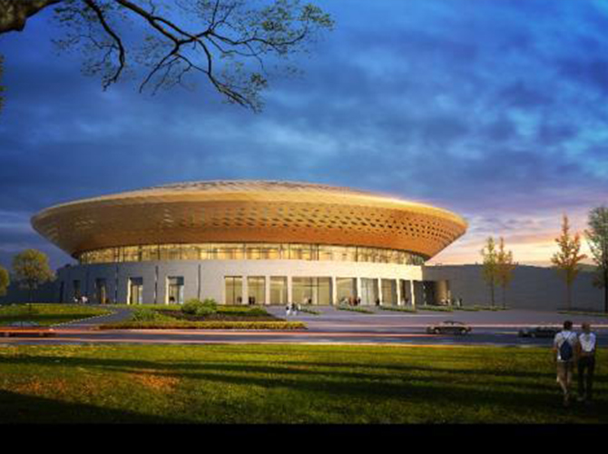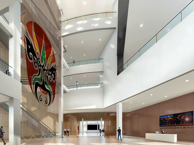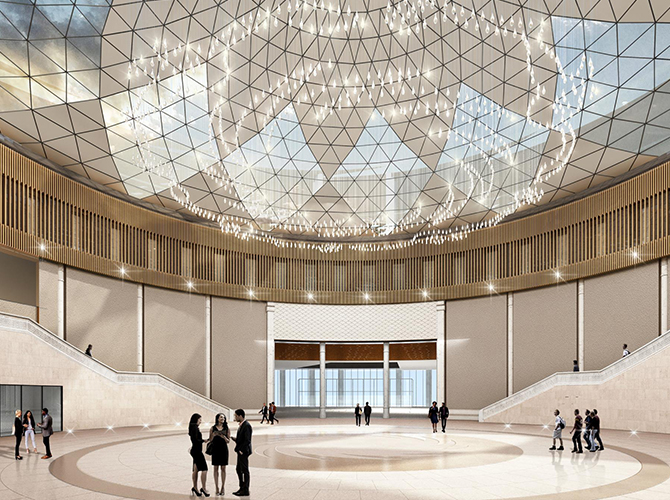 淮州新城國際會展中心采用圓形作為基本形體,通過透明玻璃幕墻從底部托起,營造出建筑整體懸浮半空的姿態,形似“UFO”飛行器。主要分為展覽中心、會議中心、航空博物館和設備用房及庫房等輔助功能區三部分功能分區。一層為展廳,服務于未來航空產業產品的展覽,二三層為會議功能區,服務于大型航空產業會議的召開,四層為航天博物館。未來,淮州新城國際會展中心將成為淮州新城通用航空產業對外展示的窗口。
