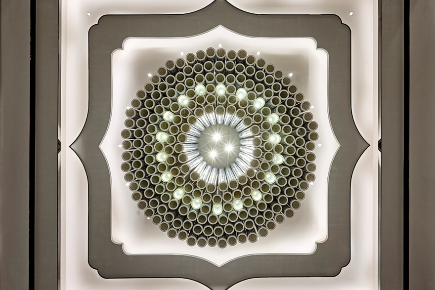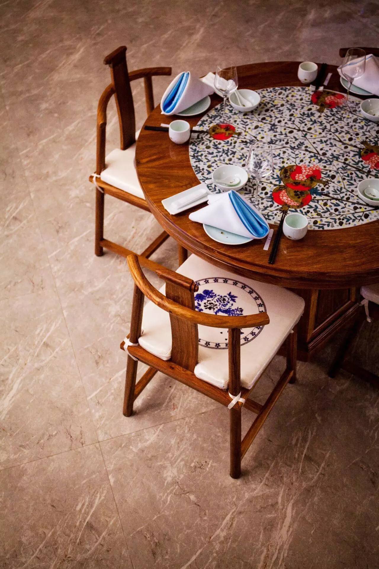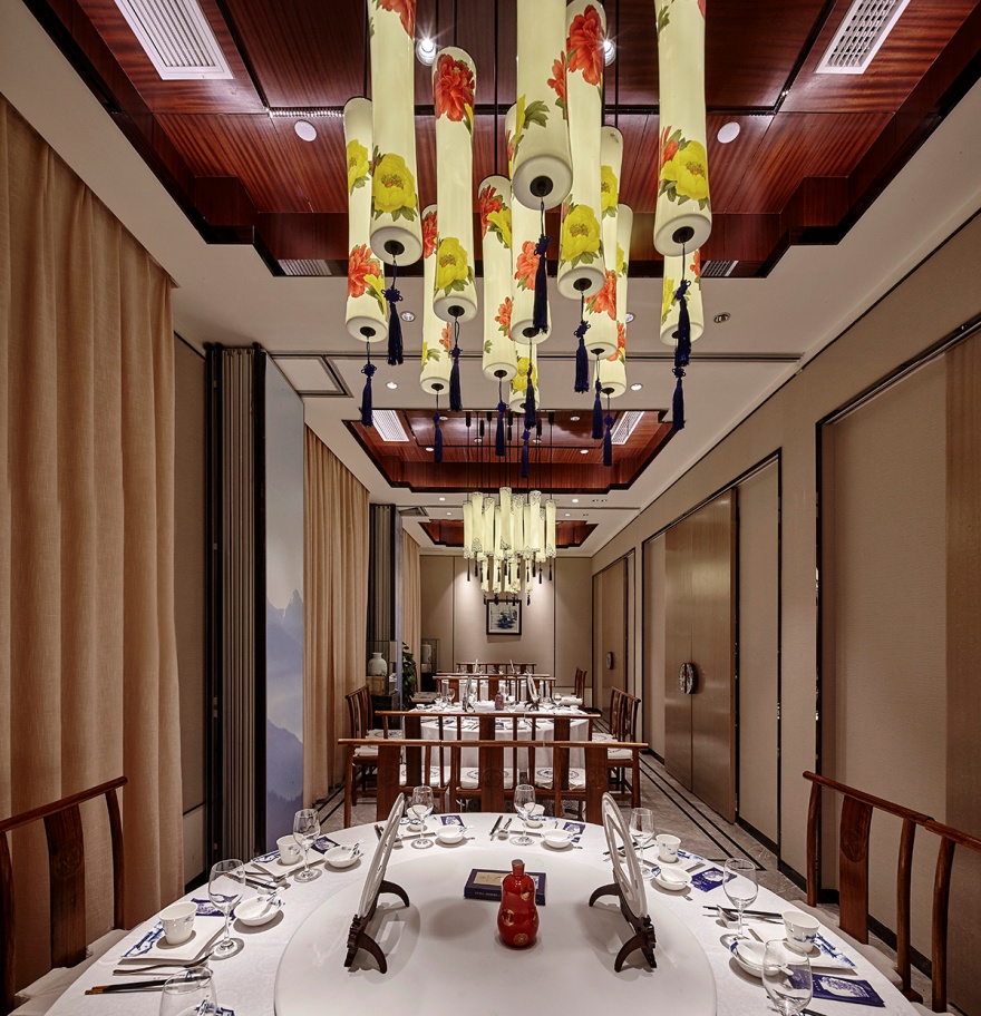 寬敞而對稱的宴客大廳,一盞3米直徑的巨型吊燈是全場的視覺焦點更是餐廳的點睛之筆,由100個薄胎青花瓷燈拼接而成,堪稱世界最大的單體陶瓷吊燈。
