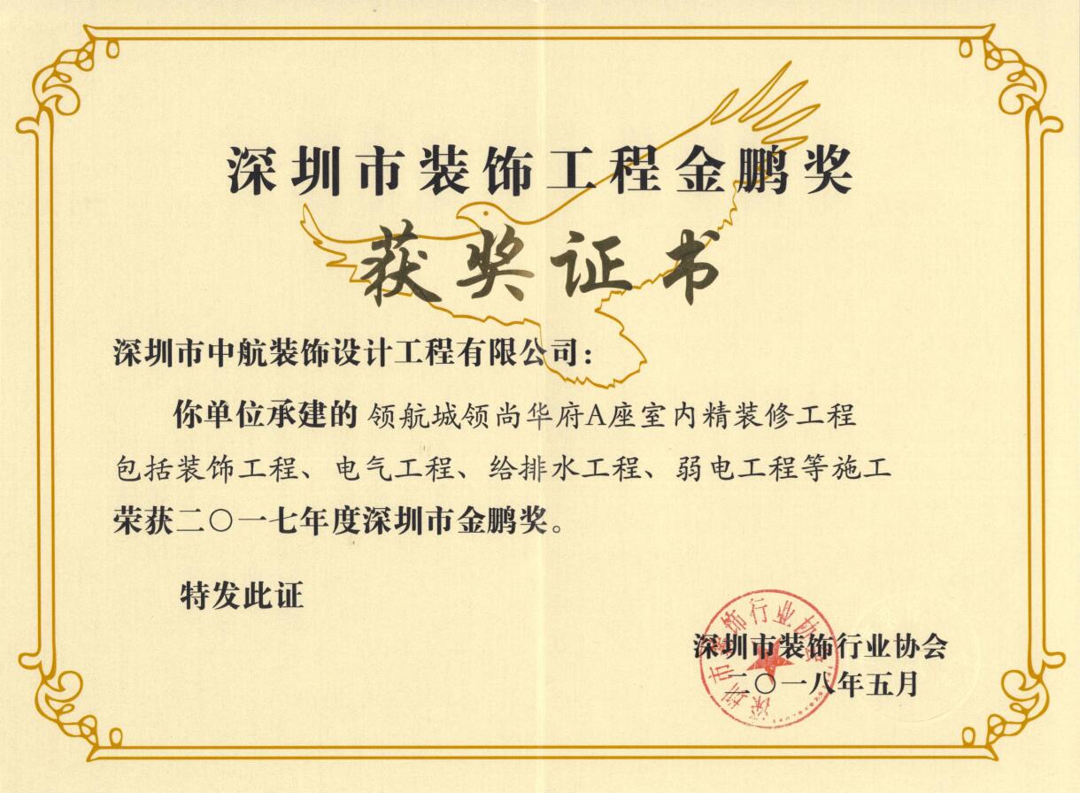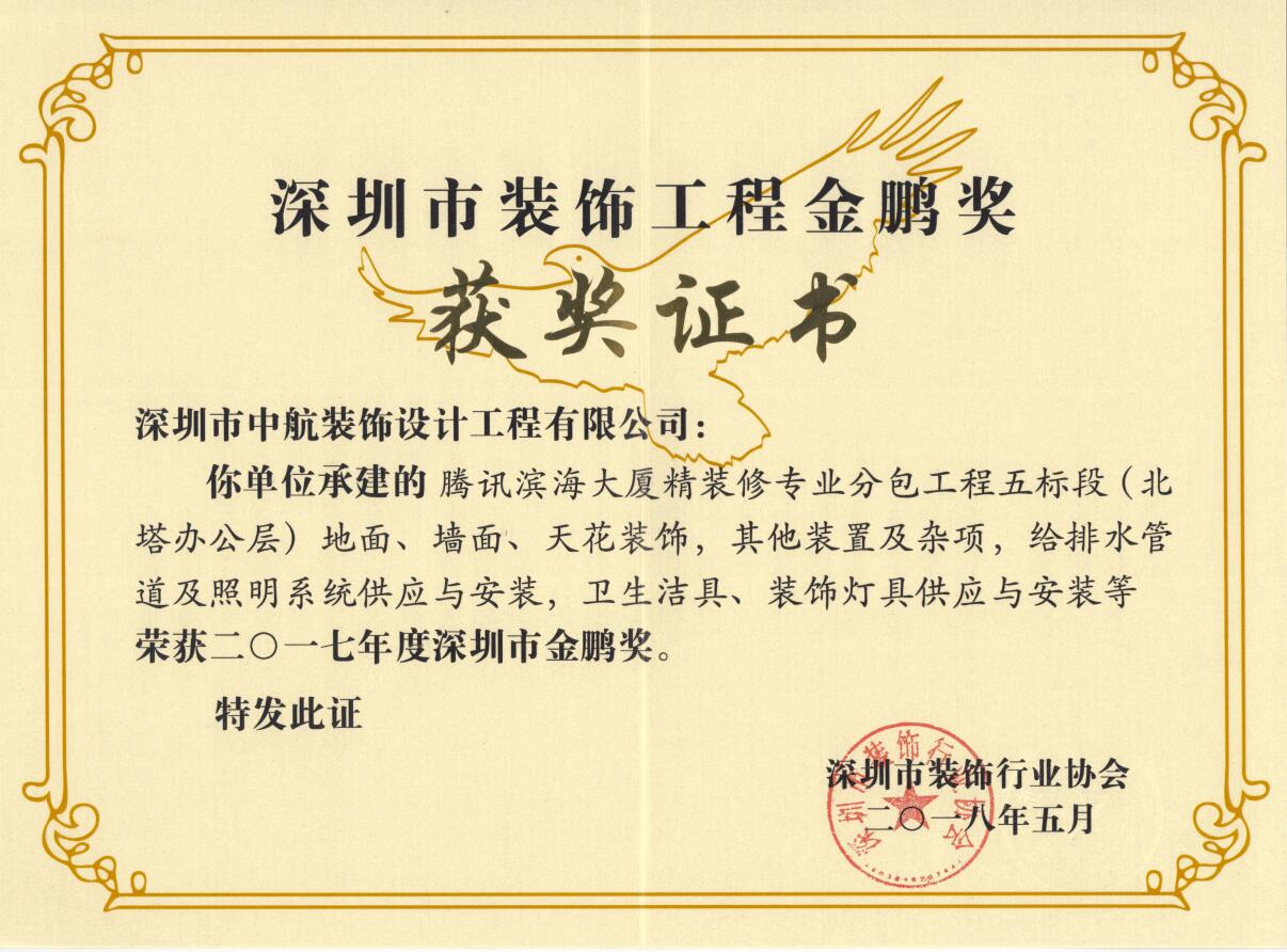 近日,代表深圳裝飾最高榮譽的2017年度深圳市裝飾工程“金鵬獎”評比揭曉,中航裝飾承建的深圳市羅湖區婦幼保健院改造工程、騰訊濱海大廈精裝修工程、領航城領尚華府精裝修工程三個項目獲獎。