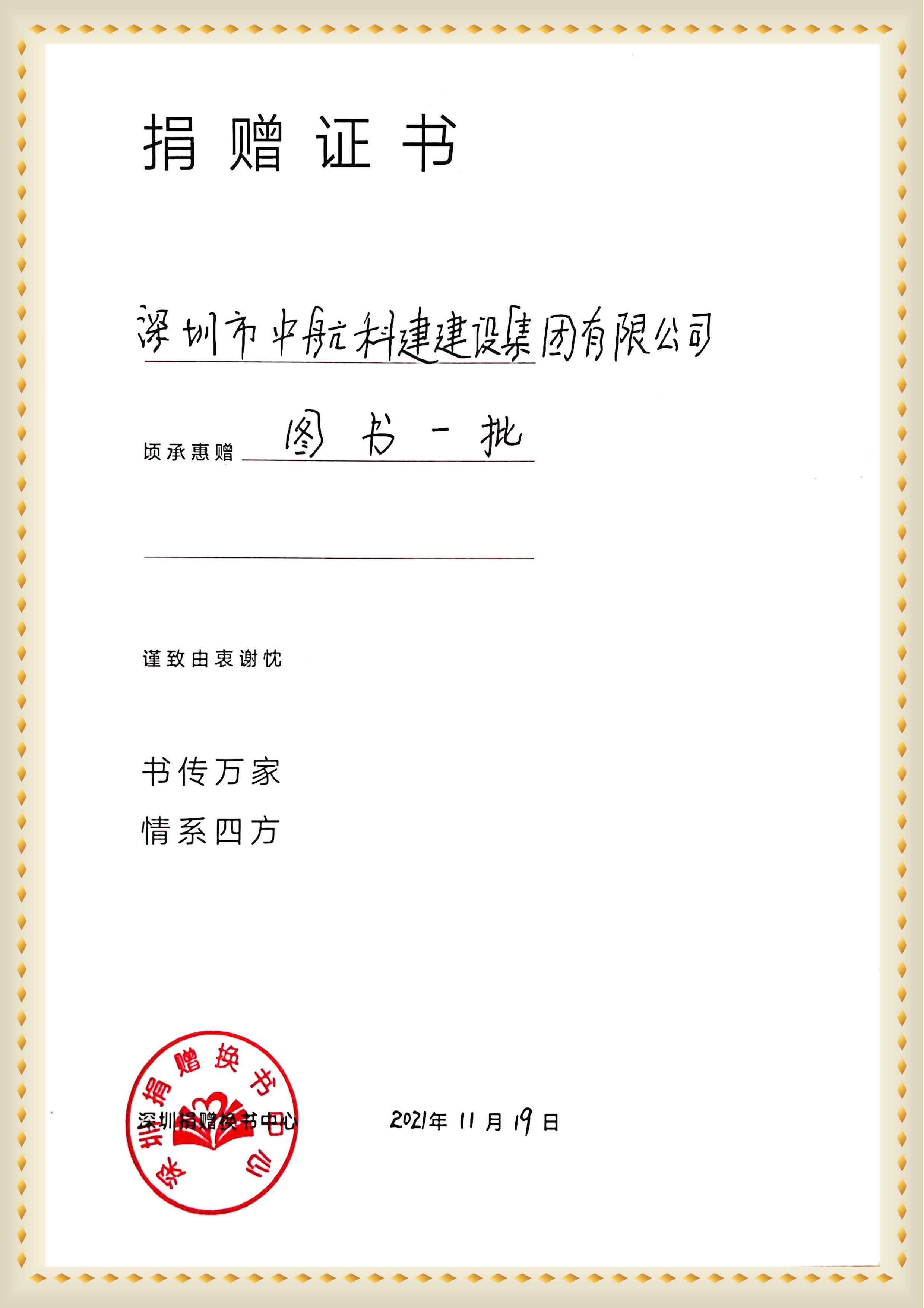 ? ? ? ?捐書活動現場,中航科建代表將一捆捆打包好的圖書搬到閱覽室,濃郁的書香飄滿圖書館的同時,也為每年的深圳市開展“讀書月”活動貢獻力量。圖書館為中航科建頒發愛心捐贈證書,并表示 “非常感謝愛心企業捐贈的書,我們一定會妥善保管,讓更多全市居民走進圖書閱覽室,享受到讀書帶來的樂趣?!?/span>