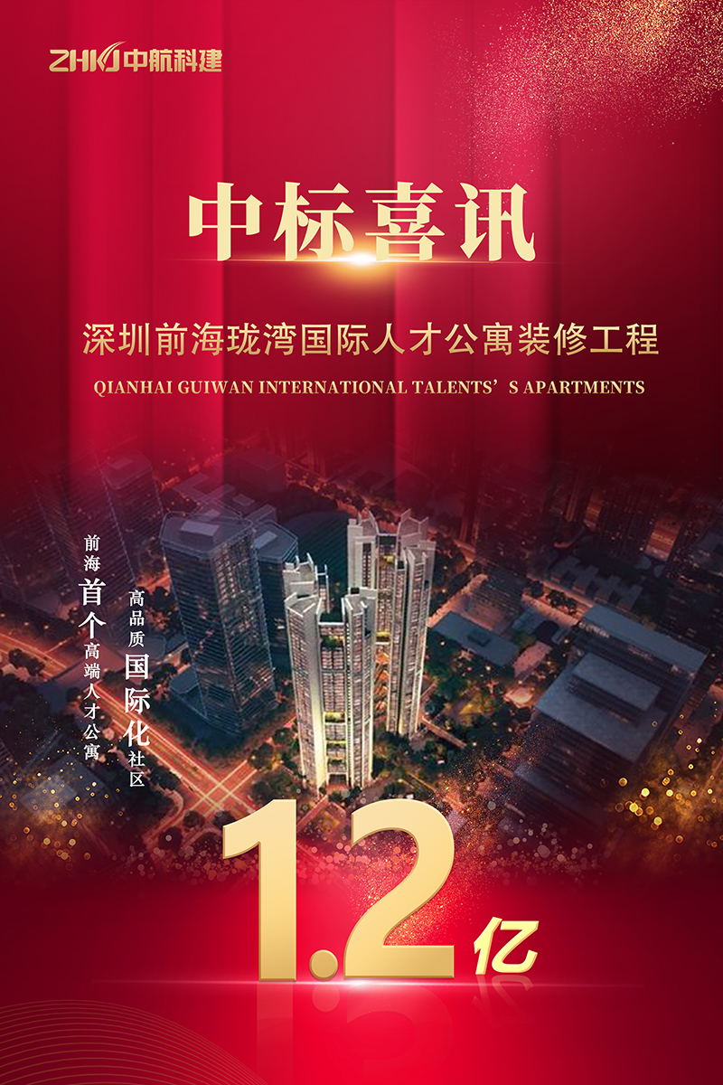 ? 風勁潮涌,逐夢先行。近日,中航科建建設集團成功中標深圳前海重點工程——瓏灣國際人才公寓裝修工程,中標金額1.2億元!