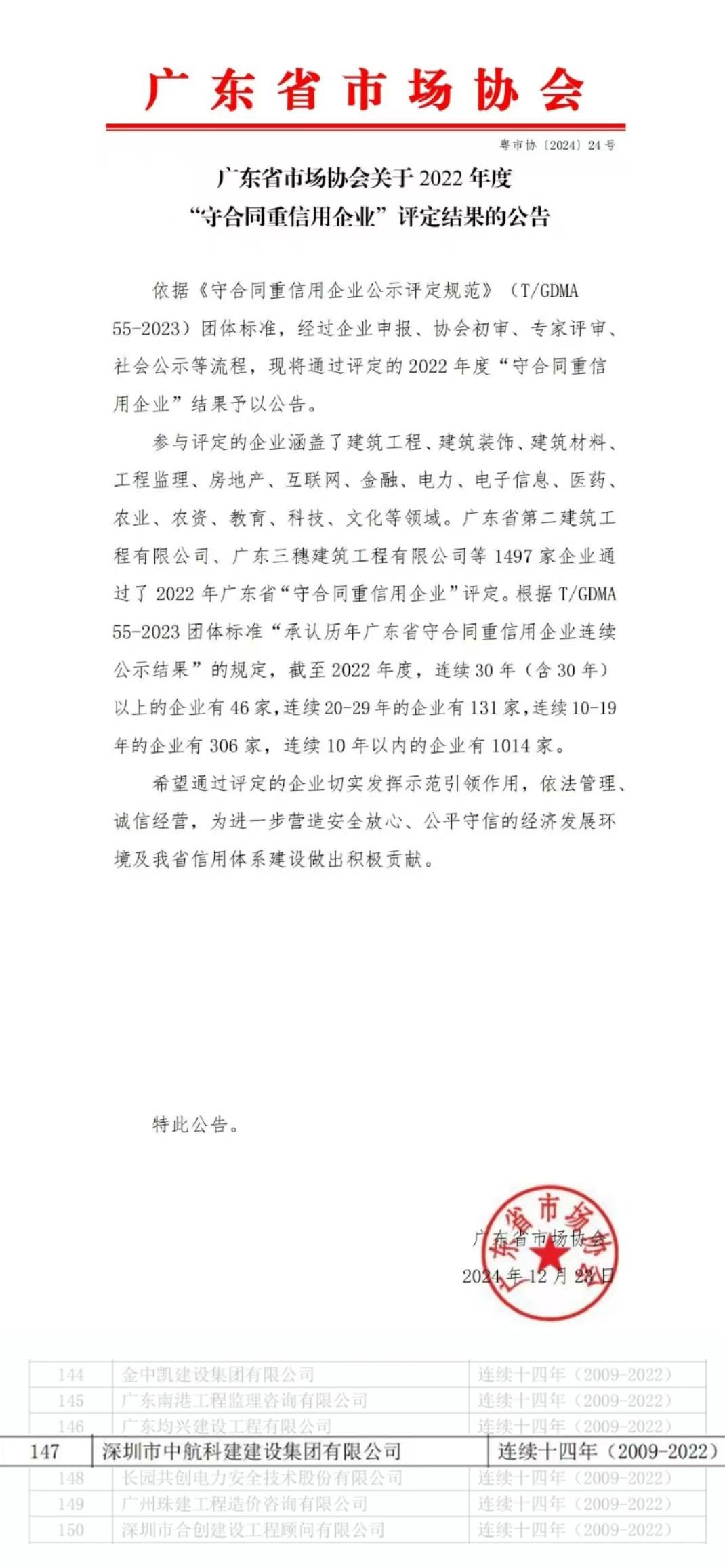 ? ? 近日,廣東省市場協會發布2022年度“守合同重信用企業”評選結果。中航科建集團連續十四年榮獲廣東省“守合同重信用企業”稱號。