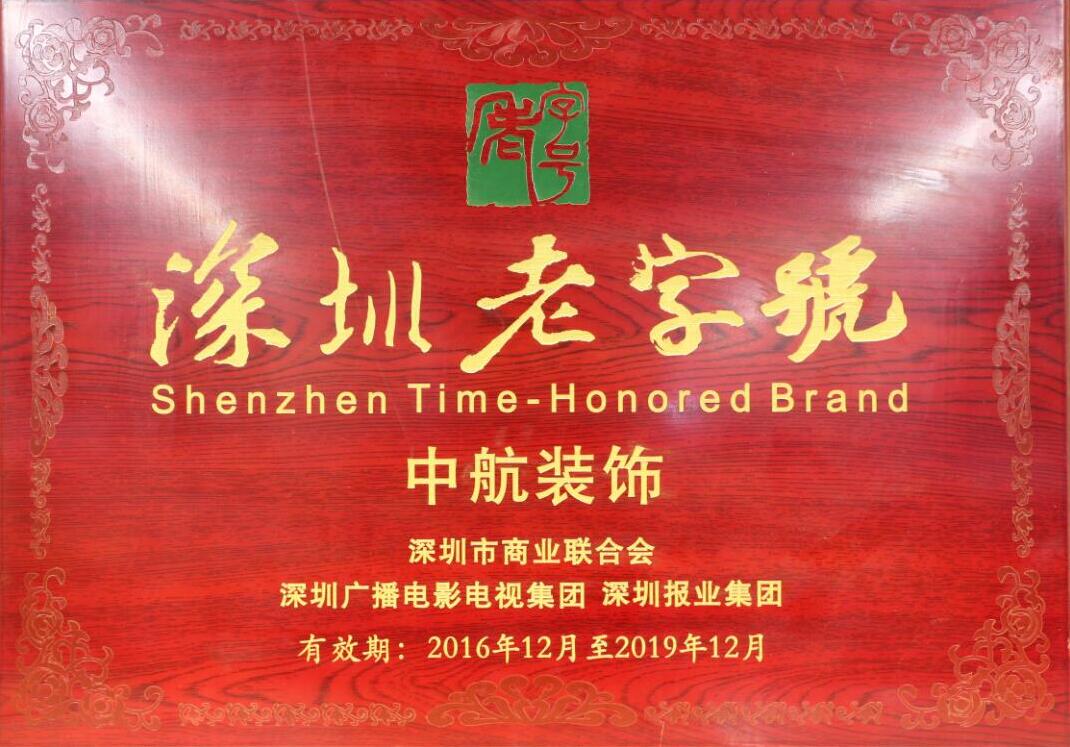“深圳老字號”承載著深圳城市發展的歷史記憶,彰顯了伴隨改革開放成長起來的深圳企業發展歷程,它的背后有著強烈的深圳色彩和價值認同。其評選參照中華老字號專業委員會的相關標準,遵循“歷史、特色、形象、影響”四大評選標準,經過實地考察、網絡投票等進行綜合考評。最終,中航裝飾作為老牌裝飾企業,憑借22年的發展歷史和良好的美譽度及廣泛的知名度,榮獲“深圳老字號”的榮譽稱號,是真正的實至名歸!